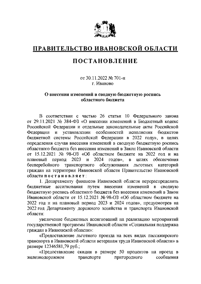 Постановление Правительства Ивановской области от 30.11.2022 N 701-п "О внесении изменений в сводную бюджетную роспись областного бюджета"