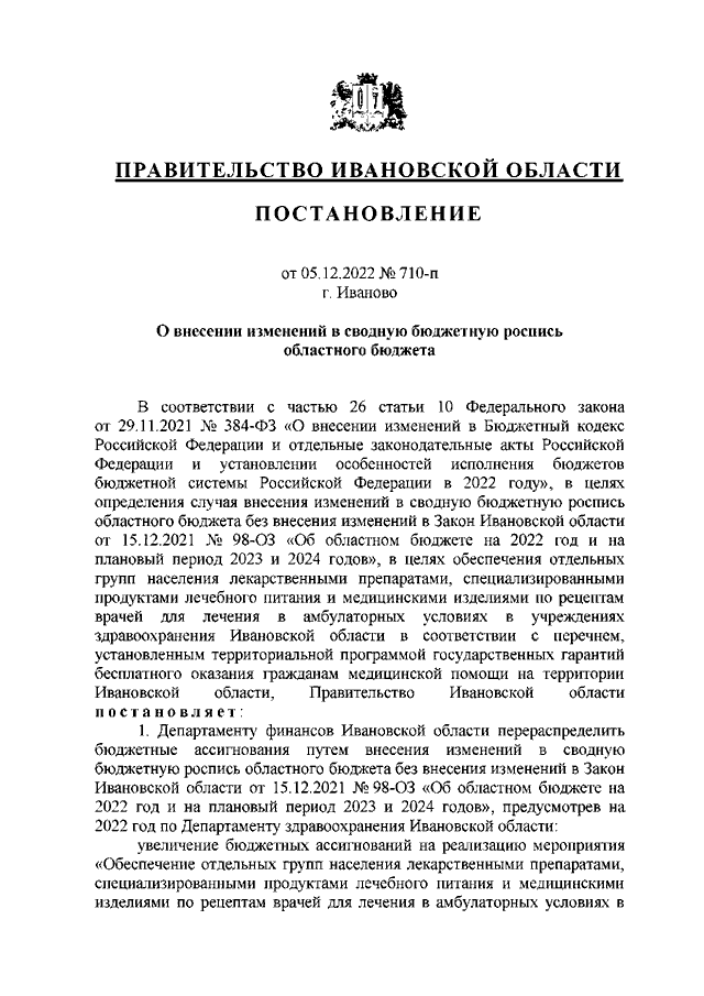 Постановление Правительства Ивановской области от 05.12.2022 N 710-п "О внесении изменений в сводную бюджетную роспись областного бюджета"
