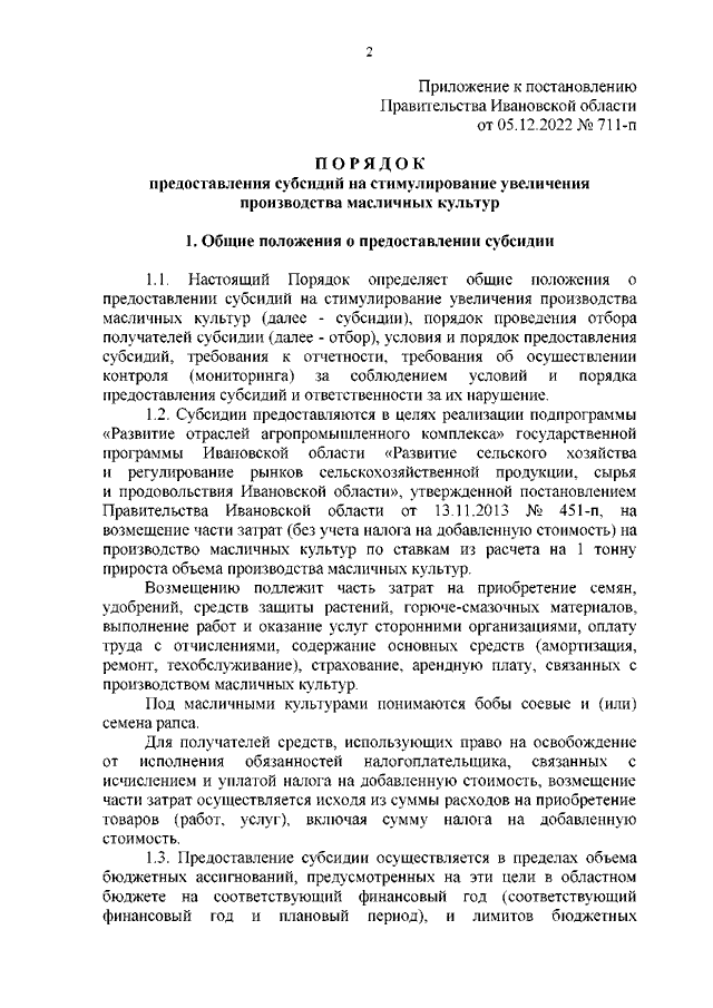 Постановление Правительства Ивановской области от 05.12.2022 N 711-п "Об утверждении Порядка предоставления субсидий на стимулирование увеличения производства масличных культур"