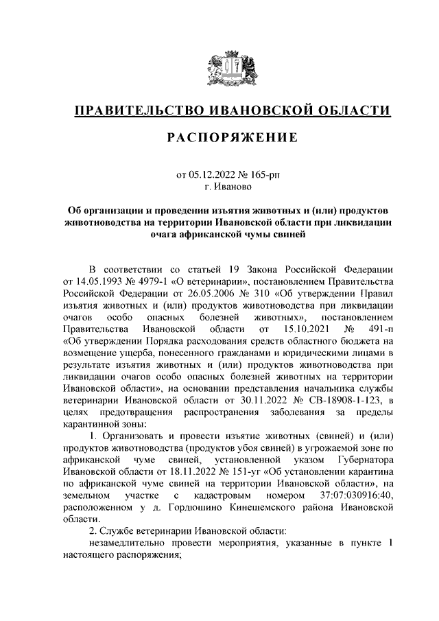 Распоряжение Правительства Ивановской области от 05.12.2022 N 165-рп "Об организации и проведении изъятия животных и (или) продуктов животноводства на территории Ивановской области при ликвидации очага африканской чумы свиней"