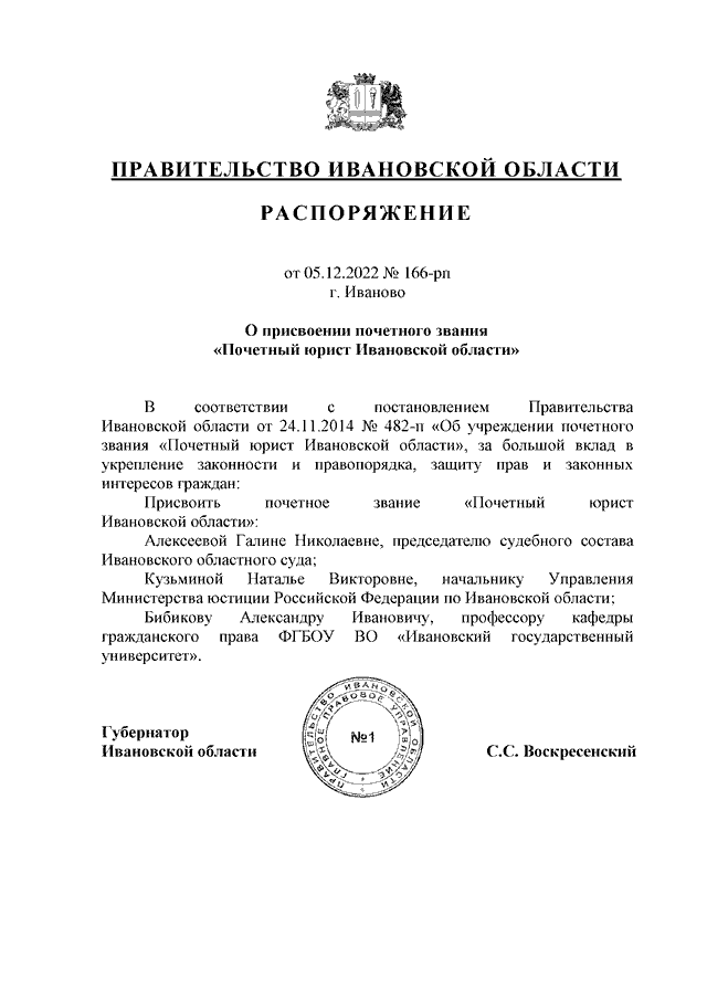Распоряжение Правительства Ивановской области от 05.12.2022 N 166-рп "О присвоении почетного звания "Почетный юрист Ивановской области"