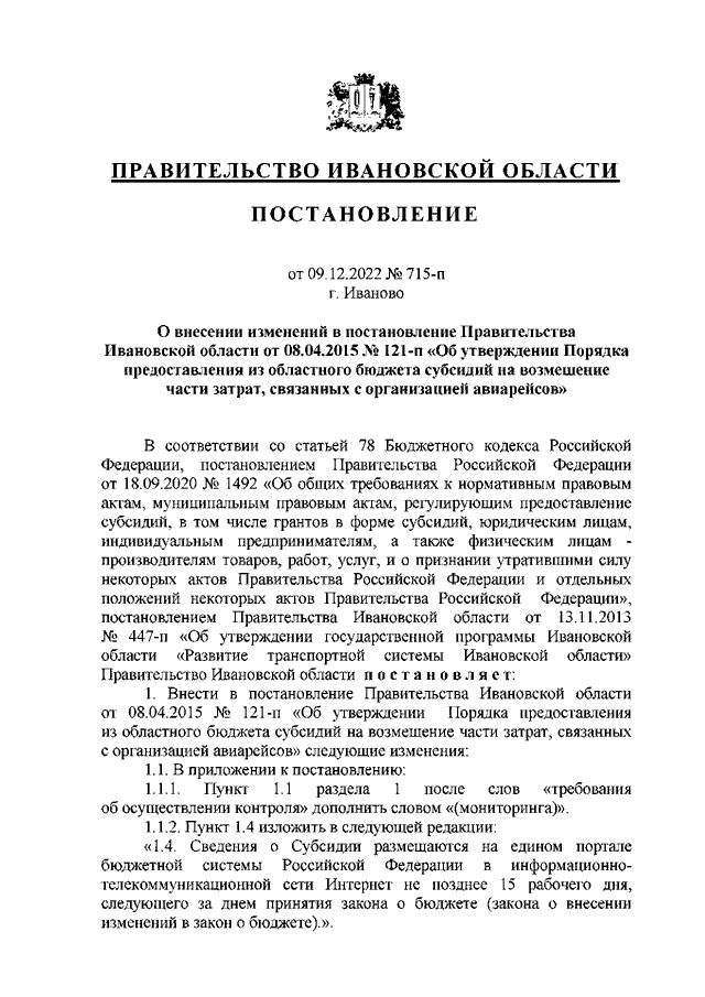 Постановление Правительства Ивановской области от 09.12.2022 N 715-п "О внесении изменений в постановление Правительства Ивановской области от 08.04.2015 N 121-п "Об утверждении Порядка предоставления из областного бюджета субсидий на возмещение части затрат, связанных с организацией авиарейсов" (вместе с "Перечнем субсидируемых маршрутов и предельный размер субсидии, предоставляемой организации воздушного транспорта на один рейс в одном направлении")
