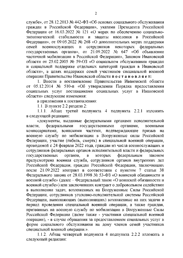 Постановление Правительства Ивановской области от 09.12.2022 N 713-п "О внесении изменений в постановления Правительства Ивановской области от 05.12.2014 N 510-п "Об утверждении Порядка предоставления социальных услуг поставщиками социальных услуг в Ивановской области" и от 27.10.2022 N 609-п "Об установлении единовременной денежной выплаты детям, пасынкам и падчерицам, в том числе совершеннолетним, граждан, принимающих участие (принимавших участие, в том числе погибших (умерших)) в специальной военной операции, проводимой с 24 февраля 2022 года, из числа военнослужащих и сотрудников федеральных органов исполнительной власти и федеральных государственных органов, в которых федеральным законом предусмотрена военная служба, сотрудников органов внутренних дел Российской Федерации, граждан Российской Федерации, заключивших после 21.09.2022 контракт в соответствии с пунктом 7 статьи 38 Федерального закона от 28.03.1998 N 53-ФЗ "О воинской обязанности и военной службе" или заключивших контракт о добровольном содействии в выполнении задач, возложенных на Вооруженные Силы Российской Федерации, сотрудников уголовно-исполнительной системы Российской Федерации, выполняющих (выполнявших) возложенные на них задачи в период проведения специальной военной операции, а также граждан, призванных на военную службу по мобилизации в Вооруженные Силы Российской Федерации, поступающим (поступившим) на обучение по образовательным программам высшего образования (программам бакалавриата и программам специалитета) и среднего профессионального образования"