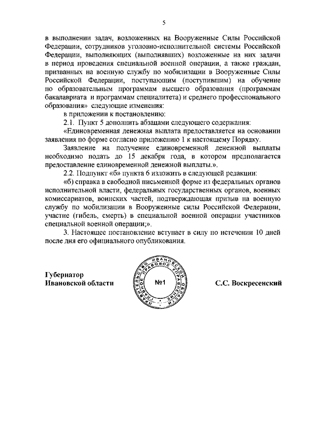 Постановление Правительства Ивановской области от 09.12.2022 N 713-п "О внесении изменений в постановления Правительства Ивановской области от 05.12.2014 N 510-п "Об утверждении Порядка предоставления социальных услуг поставщиками социальных услуг в Ивановской области" и от 27.10.2022 N 609-п "Об установлении единовременной денежной выплаты детям, пасынкам и падчерицам, в том числе совершеннолетним, граждан, принимающих участие (принимавших участие, в том числе погибших (умерших)) в специальной военной операции, проводимой с 24 февраля 2022 года, из числа военнослужащих и сотрудников федеральных органов исполнительной власти и федеральных государственных органов, в которых федеральным законом предусмотрена военная служба, сотрудников органов внутренних дел Российской Федерации, граждан Российской Федерации, заключивших после 21.09.2022 контракт в соответствии с пунктом 7 статьи 38 Федерального закона от 28.03.1998 N 53-ФЗ "О воинской обязанности и военной службе" или заключивших контракт о добровольном содействии в выполнении задач, возложенных на Вооруженные Силы Российской Федерации, сотрудников уголовно-исполнительной системы Российской Федерации, выполняющих (выполнявших) возложенные на них задачи в период проведения специальной военной операции, а также граждан, призванных на военную службу по мобилизации в Вооруженные Силы Российской Федерации, поступающим (поступившим) на обучение по образовательным программам высшего образования (программам бакалавриата и программам специалитета) и среднего профессионального образования"