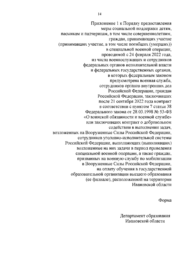 Постановление Правительства Ивановской области от 13.12.2022 N 721-п "Об утверждении Порядка предоставления меры социальной поддержки детям, пасынкам и падчерицам, в том числе совершеннолетним, граждан, принимающих участие (принимавших участие, в том числе погибших (умерших)) в специальной военной операции, проводимой с 24 февраля 2022 года, из числа военнослужащих и сотрудников федеральных органов исполнительной власти и федеральных государственных органов, в которых федеральным законом предусмотрена военная служба, сотрудников органов внутренних дел Российской Федерации, граждан Российской Федерации, заключивших после 21 сентября 2022 года контракт в соответствии с пунктом 7 статьи 38 Федерального закона от 28.03.1998 N 53-ФЗ "О воинской обязанности и военной службе" или заключивших контракт о добровольном содействии в выполнении задач, возложенных на Вооруженные Силы Российской Федерации, сотрудников уголовно-исполнительной системы Российской Федерации, выполняющих (выполнявших) возложенные на них задачи в период проведения специальной военной операции, а также граждан, призванных на военную службу по мобилизации в Вооруженные Силы Российской Федерации, на оплату обучения в государственной образовательной организации высшего образования (ее филиале), расположенной на территории Ивановской области"