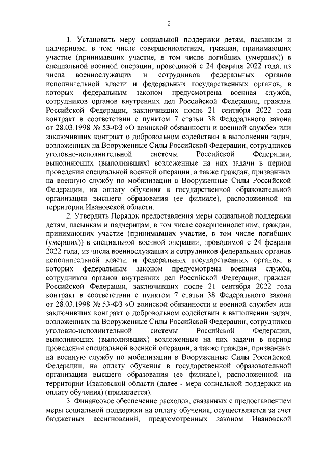 Постановление Правительства Ивановской области от 13.12.2022 N 721-п "Об утверждении Порядка предоставления меры социальной поддержки детям, пасынкам и падчерицам, в том числе совершеннолетним, граждан, принимающих участие (принимавших участие, в том числе погибших (умерших)) в специальной военной операции, проводимой с 24 февраля 2022 года, из числа военнослужащих и сотрудников федеральных органов исполнительной власти и федеральных государственных органов, в которых федеральным законом предусмотрена военная служба, сотрудников органов внутренних дел Российской Федерации, граждан Российской Федерации, заключивших после 21 сентября 2022 года контракт в соответствии с пунктом 7 статьи 38 Федерального закона от 28.03.1998 N 53-ФЗ "О воинской обязанности и военной службе" или заключивших контракт о добровольном содействии в выполнении задач, возложенных на Вооруженные Силы Российской Федерации, сотрудников уголовно-исполнительной системы Российской Федерации, выполняющих (выполнявших) возложенные на них задачи в период проведения специальной военной операции, а также граждан, призванных на военную службу по мобилизации в Вооруженные Силы Российской Федерации, на оплату обучения в государственной образовательной организации высшего образования (ее филиале), расположенной на территории Ивановской области"