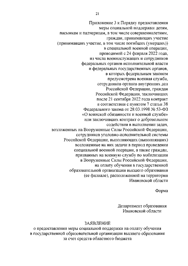 Постановление Правительства Ивановской области от 13.12.2022 N 721-п "Об утверждении Порядка предоставления меры социальной поддержки детям, пасынкам и падчерицам, в том числе совершеннолетним, граждан, принимающих участие (принимавших участие, в том числе погибших (умерших)) в специальной военной операции, проводимой с 24 февраля 2022 года, из числа военнослужащих и сотрудников федеральных органов исполнительной власти и федеральных государственных органов, в которых федеральным законом предусмотрена военная служба, сотрудников органов внутренних дел Российской Федерации, граждан Российской Федерации, заключивших после 21 сентября 2022 года контракт в соответствии с пунктом 7 статьи 38 Федерального закона от 28.03.1998 N 53-ФЗ "О воинской обязанности и военной службе" или заключивших контракт о добровольном содействии в выполнении задач, возложенных на Вооруженные Силы Российской Федерации, сотрудников уголовно-исполнительной системы Российской Федерации, выполняющих (выполнявших) возложенные на них задачи в период проведения специальной военной операции, а также граждан, призванных на военную службу по мобилизации в Вооруженные Силы Российской Федерации, на оплату обучения в государственной образовательной организации высшего образования (ее филиале), расположенной на территории Ивановской области"