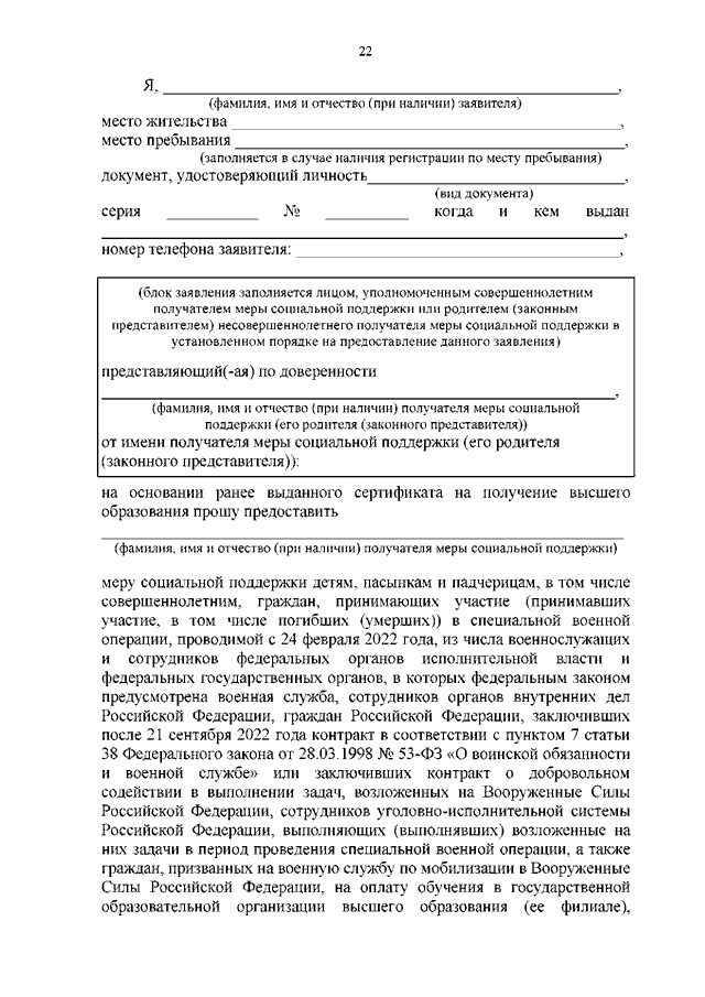 Постановление Правительства Ивановской области от 13.12.2022 N 721-п "Об утверждении Порядка предоставления меры социальной поддержки детям, пасынкам и падчерицам, в том числе совершеннолетним, граждан, принимающих участие (принимавших участие, в том числе погибших (умерших)) в специальной военной операции, проводимой с 24 февраля 2022 года, из числа военнослужащих и сотрудников федеральных органов исполнительной власти и федеральных государственных органов, в которых федеральным законом предусмотрена военная служба, сотрудников органов внутренних дел Российской Федерации, граждан Российской Федерации, заключивших после 21 сентября 2022 года контракт в соответствии с пунктом 7 статьи 38 Федерального закона от 28.03.1998 N 53-ФЗ "О воинской обязанности и военной службе" или заключивших контракт о добровольном содействии в выполнении задач, возложенных на Вооруженные Силы Российской Федерации, сотрудников уголовно-исполнительной системы Российской Федерации, выполняющих (выполнявших) возложенные на них задачи в период проведения специальной военной операции, а также граждан, призванных на военную службу по мобилизации в Вооруженные Силы Российской Федерации, на оплату обучения в государственной образовательной организации высшего образования (ее филиале), расположенной на территории Ивановской области"
