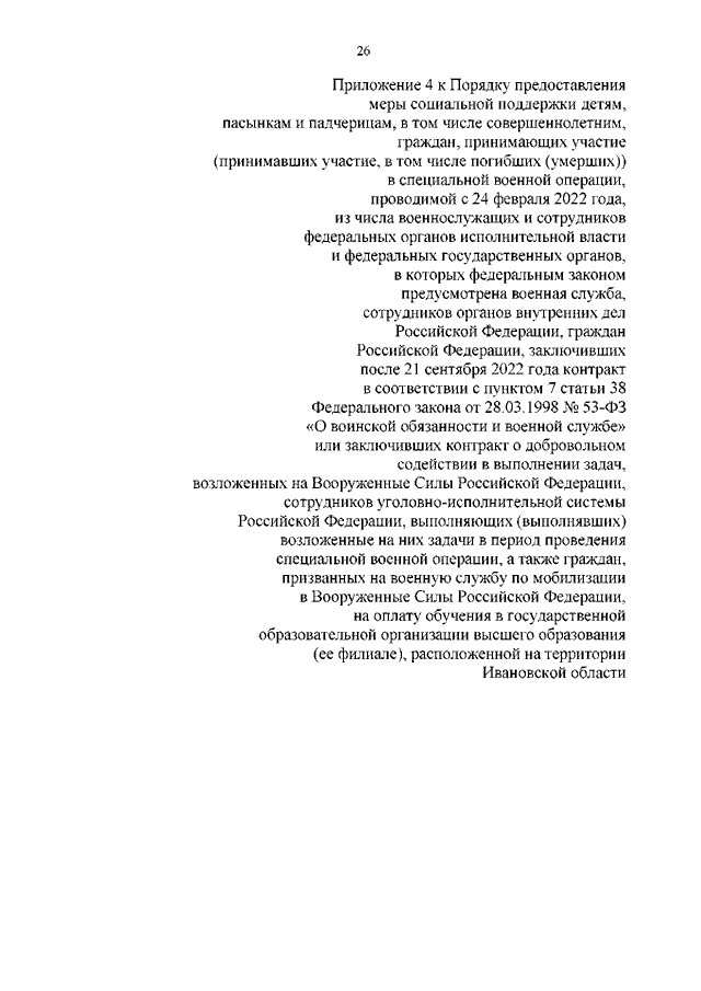 Постановление Правительства Ивановской области от 13.12.2022 N 721-п "Об утверждении Порядка предоставления меры социальной поддержки детям, пасынкам и падчерицам, в том числе совершеннолетним, граждан, принимающих участие (принимавших участие, в том числе погибших (умерших)) в специальной военной операции, проводимой с 24 февраля 2022 года, из числа военнослужащих и сотрудников федеральных органов исполнительной власти и федеральных государственных органов, в которых федеральным законом предусмотрена военная служба, сотрудников органов внутренних дел Российской Федерации, граждан Российской Федерации, заключивших после 21 сентября 2022 года контракт в соответствии с пунктом 7 статьи 38 Федерального закона от 28.03.1998 N 53-ФЗ "О воинской обязанности и военной службе" или заключивших контракт о добровольном содействии в выполнении задач, возложенных на Вооруженные Силы Российской Федерации, сотрудников уголовно-исполнительной системы Российской Федерации, выполняющих (выполнявших) возложенные на них задачи в период проведения специальной военной операции, а также граждан, призванных на военную службу по мобилизации в Вооруженные Силы Российской Федерации, на оплату обучения в государственной образовательной организации высшего образования (ее филиале), расположенной на территории Ивановской области"