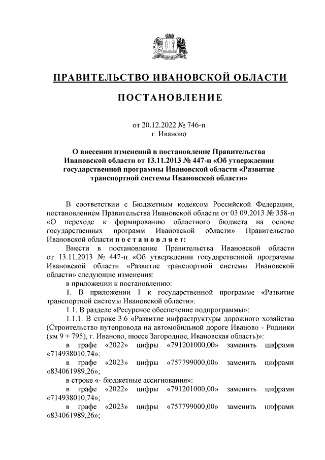 Постановление Правительства Ивановской области от 20.12.2022 N 746-п "О внесении изменений в постановление Правительства Ивановской области от 13.11.2013 N 447-п "Об утверждении государственной программы Ивановской области "Развитие транспортной системы Ивановской области"