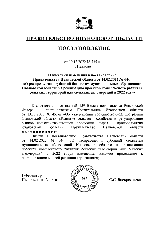 Постановление Правительства Ивановской области от 19.12.2022 N 735-п "О внесении изменения в постановление Правительства Ивановской области от 14.02.2022 N 64-п "О распределении субсидий бюджетам муниципальных образований Ивановской области на реализацию проектов комплексного развития сельских территорий или сельских агломераций в 2022 году"