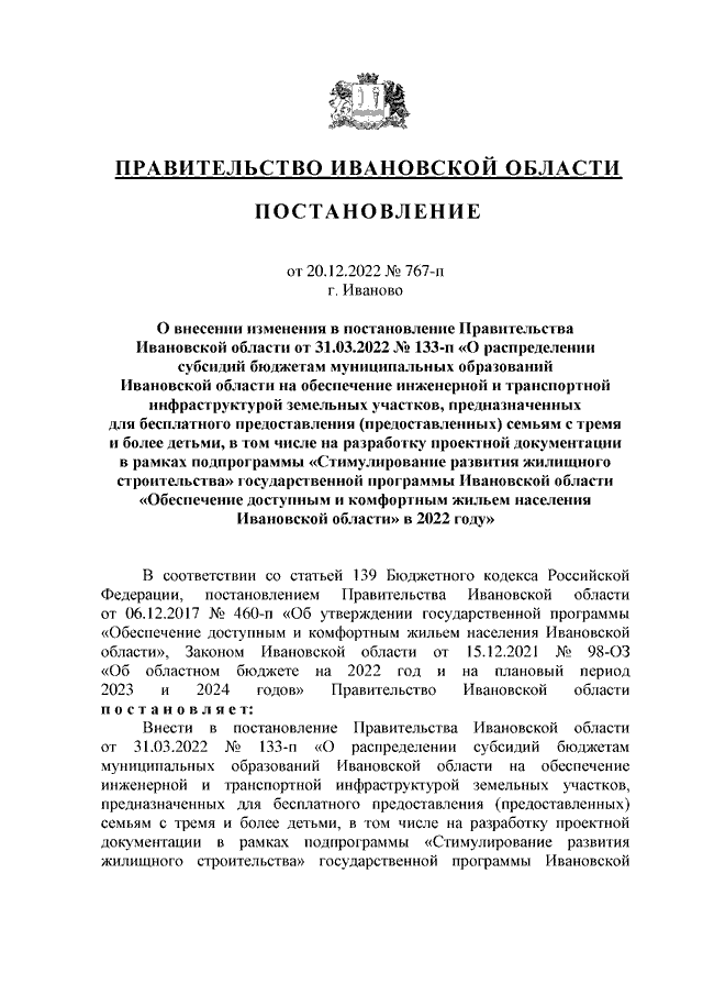 Постановление Правительства Ивановской области от 20.12.2022 N 767-п "О внесении изменения в постановление Правительства Ивановской области от 31.03.2022 N 133-п "О распределении субсидий бюджетам муниципальных образований Ивановской области на обеспечение инженерной и транспортной инфраструктурой земельных участков, предназначенных для бесплатного предоставления (предоставленных) семьям с тремя и более детьми, в том числе на разработку проектной документации в рамках подпрограммы "Стимулирование развития жилищного строительства" государственной программы Ивановской области "Обеспечение доступным и комфортным жильем населения Ивановской области" в 2022 году"