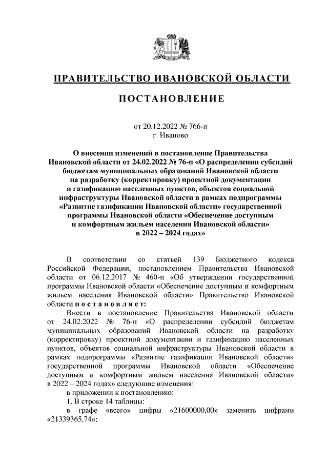 Постановление Правительства Ивановской области от 20.12.2022 N 766-п "О внесении изменений в постановление Правительства Ивановской области от 24.02.2022 N 76-п "О распределении субсидий бюджетам муниципальных образований Ивановской области на разработку (корректировку) проектной документации и газификацию населенных пунктов, объектов социальной инфраструктуры Ивановской области в рамках подпрограммы "Развитие газификации Ивановской области" государственной программы Ивановской области "Обеспечение доступным и комфортным жильем населения Ивановской области" в 2022 - 2024 годах"