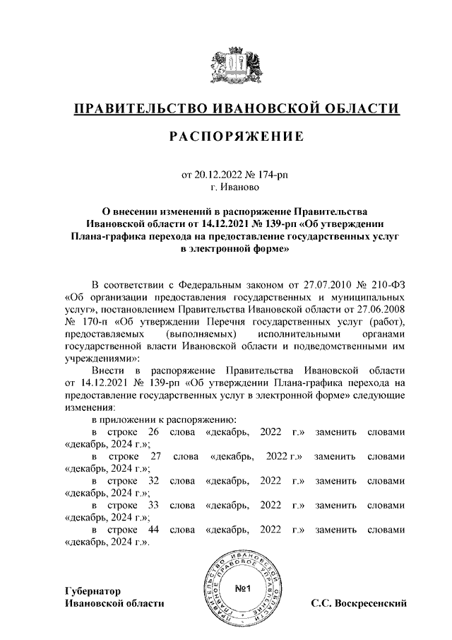 Распоряжение Правительства Ивановской области от 20.12.2022 N 174-рп "О внесении изменений в распоряжение Правительства Ивановской области от 14.12.2021 N 139-рп "Об утверждении Плана-графика перехода на предоставление государственных услуг в электронной форме"