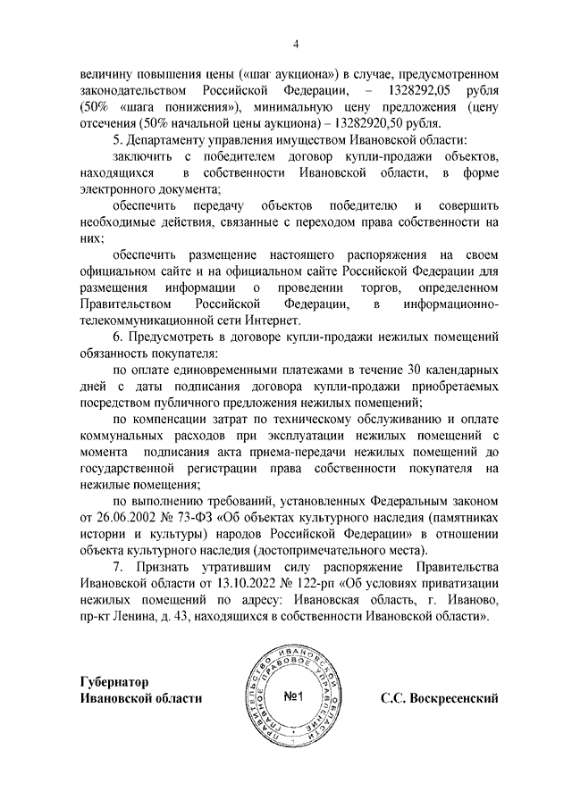 Распоряжение Правительства Ивановской области от 20.12.2022 N 181-рп "Об условиях приватизации нежилых помещений по адресу: Ивановская область, г. Иваново, пр-кт Ленина, д. 43, находящихся в собственности Ивановской области"