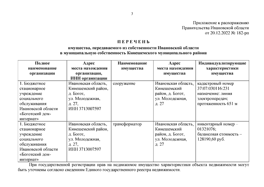 Распоряжение Правительства Ивановской области от 20.12.2022 N 182-рп "О передаче имущества из собственности Ивановской области в муниципальную собственность Кинешемского муниципального района"