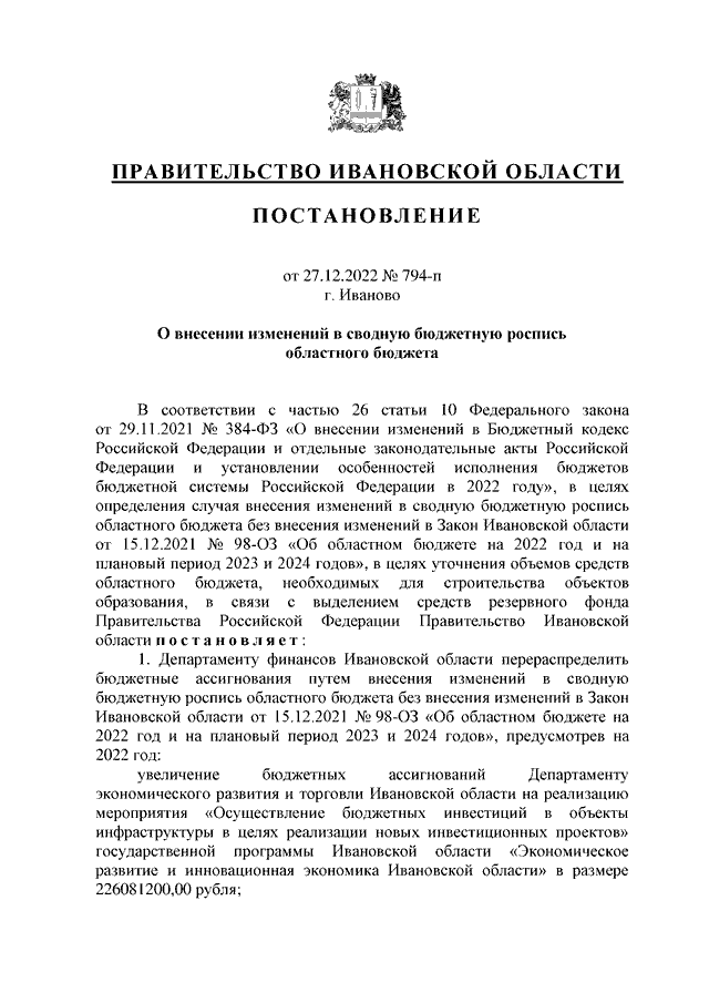 Постановление Правительства Ивановской области от 27.12.2022 N 794-п "О внесении изменений в сводную бюджетную роспись областного бюджета"