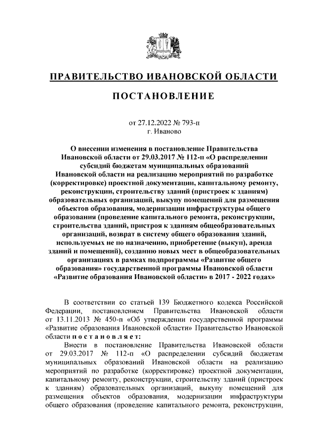 Постановление Правительства Ивановской области от 27.12.2022 N 793-п "О внесении изменения в постановление Правительства Ивановской области от 29.03.2017 N 112-п "О распределении субсидий бюджетам муниципальных образований Ивановской области на реализацию мероприятий по разработке (корректировке) проектной документации, капитальному ремонту, реконструкции, строительству зданий (пристроек к зданиям) образовательных организаций, выкупу помещений для размещения объектов образования, модернизации инфраструктуры общего образования (проведение капитального ремонта, реконструкции, строительства зданий, пристроя к зданиям общеобразовательных организаций, возврат в систему общего образования зданий, используемых не по назначению, приобретение (выкуп), аренда зданий и помещений), созданию новых мест в общеобразовательных организациях в рамках подпрограммы "Развитие общего образования" государственной программы Ивановской области "Развитие образования Ивановской области" в 2017 - 2022 годах"