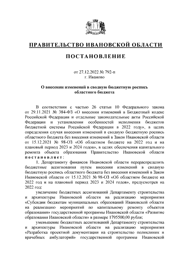 Постановление Правительства Ивановской области от 27.12.2022 N 792-п "О внесении изменений в сводную бюджетную роспись областного бюджета"