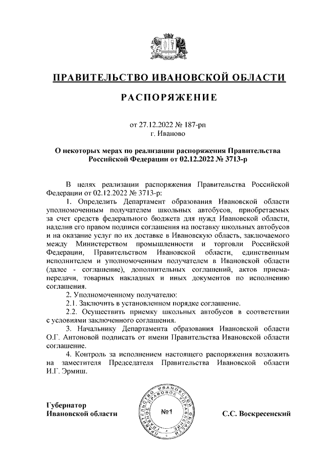 Распоряжение Правительства Ивановской области от 27.12.2022 N 187-рп "О некоторых мерах по реализации распоряжения Правительства Российской Федерации от 02.12.2022 N 3713-р"