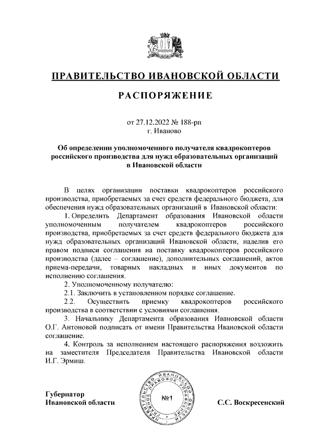 Распоряжение Правительства Ивановской области от 27.12.2022 N 188-рп "Об определении уполномоченного получателя квадрокоптеров российского производства для нужд образовательных организаций в Ивановской области"