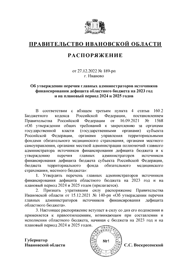Распоряжение Правительства Ивановской области от 27.12.2022 N 189-рп "Об утверждении перечня главных администраторов источников финансирования дефицита областного бюджета на 2023 год и на плановый период 2024 и 2025 годов"