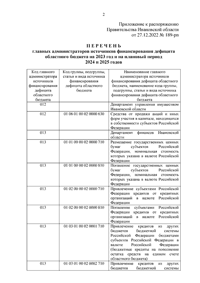 Распоряжение Правительства Ивановской области от 27.12.2022 N 189-рп "Об утверждении перечня главных администраторов источников финансирования дефицита областного бюджета на 2023 год и на плановый период 2024 и 2025 годов"