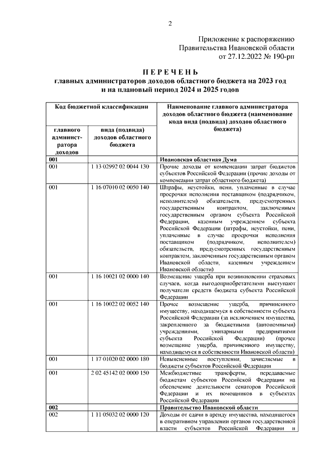 Распоряжение Правительства Ивановской области от 27.12.2022 N 190-рп "Об утверждении перечня главных администраторов доходов областного бюджета на 2023 год и на плановый период 2024 и 2025 годов"