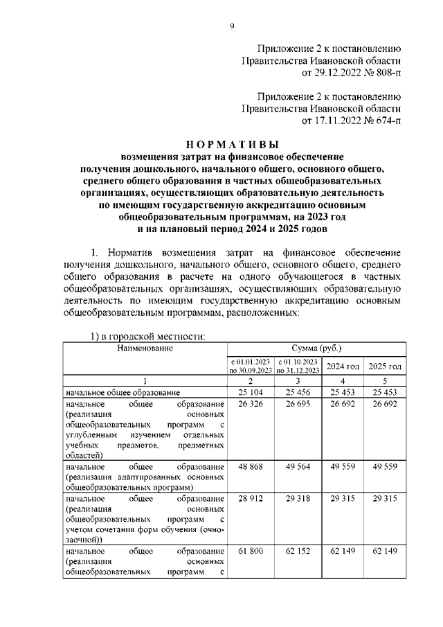 Постановление Правительства Ивановской области от 29.12.2022 N 808-п "О внесении изменений в постановление Правительства Ивановской области от 17.11.2022 N 674-п "Об утверждении нормативов обеспечения государственных гарантий реализации прав на получение общедоступного бесплатного общего образования, обеспечения дополнительного образования в муниципальных образовательных организациях и возмещения затрат на финансовое обеспечение получения общего образования в частных образовательных организациях на 2023 год и на плановый период 2024 и 2025 годов" (вместе с "Нормативами обеспечения государственных гарантий реализации прав на получение общедоступного и бесплатного дошкольного, начального общего, основного общего, среднего общего образования в муниципальных общеобразовательных организациях, обеспечения дополнительного образования в муниципальных общеобразовательных организациях на 2023 год и на плановый период 2024 и 2025 годов", "Нормативами возмещения затрат на финансовое обеспечение получения дошкольного, начального общего, основного общего, среднего общего образования в частных общеобразовательных организациях, осуществляющих образовательную деятельность по имеющим государственную аккредитацию основным общеобразовательным программам, на 2023 год и на плановый период 2024 и 2025 годов", "Нормативами обеспечения государственных гарантий реализации прав на получение общедоступного и бесплатного дошкольного образования в муниципальных дошкольных образовательных организациях на 2023 год и на плановый период 2024 и 2025 годов", "Нормативами возмещения затрат на финансовое обеспечение получения дошкольного образования в частных дошкольных образовательных организациях на 2023 год и на плановый период 2024 и 2025 годов")