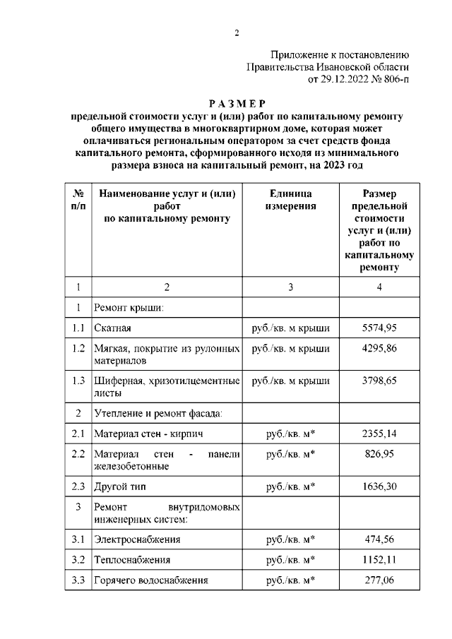 Постановление Правительства Ивановской области от 29.12.2022 N 806-п "Об установлении размера предельной стоимости услуг и (или) работ по капитальному ремонту общего имущества в многоквартирном доме, которая может оплачиваться региональным оператором за счет средств фонда капитального ремонта, сформированного исходя из минимального размера взноса на капитальный ремонт, на 2023 год"