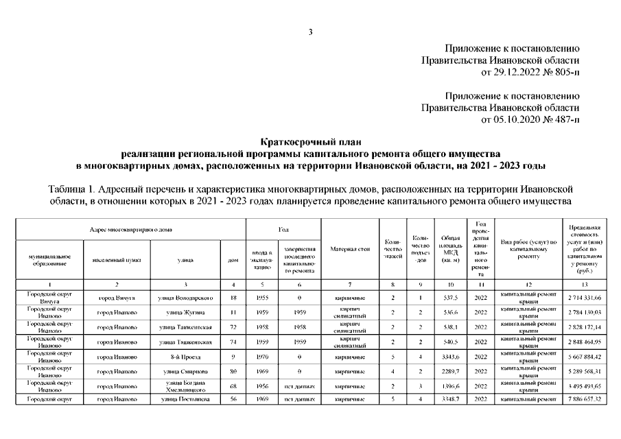 Постановление Правительства Ивановской области от 29.12.2022 N 805-п "О внесении изменения в постановление Правительства Ивановской области от 05.10.2020 N 487-п "Об утверждении краткосрочного плана реализации региональной программы капитального ремонта общего имущества в многоквартирных домах, расположенных на территории Ивановской области, на 2021 - 2023 годы"