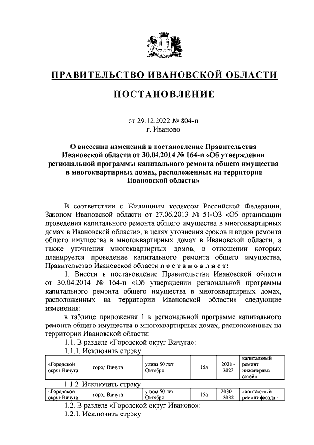 Постановление Правительства Ивановской области от 29.12.2022 N 804-п "О внесении изменений в постановление Правительства Ивановской области от 30.04.2014 N 164-п "Об утверждении региональной программы капитального ремонта общего имущества в многоквартирных домах, расположенных на территории Ивановской области"