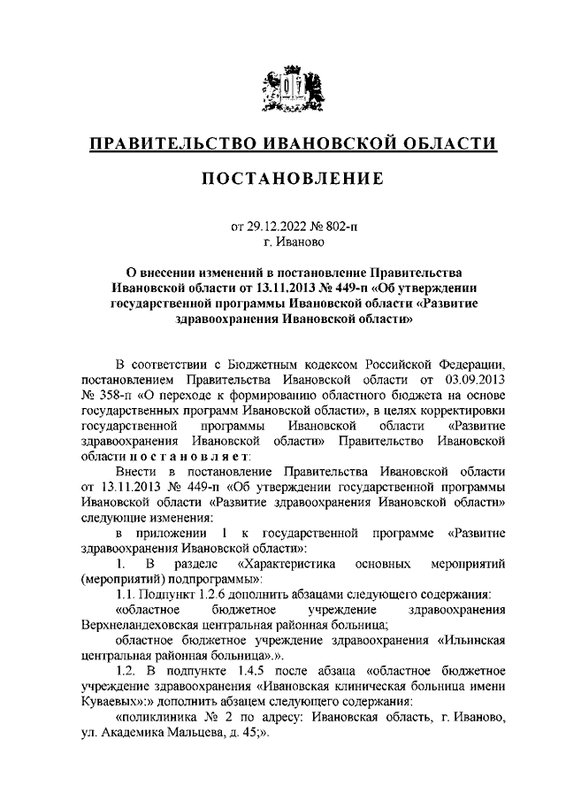 Постановление Правительства Ивановской области от 29.12.2022 N 802-п "О внесении изменений в постановление Правительства Ивановской области от 13.11.2013 N 449-п "Об утверждении государственной программы Ивановской области "Развитие здравоохранения Ивановской области"