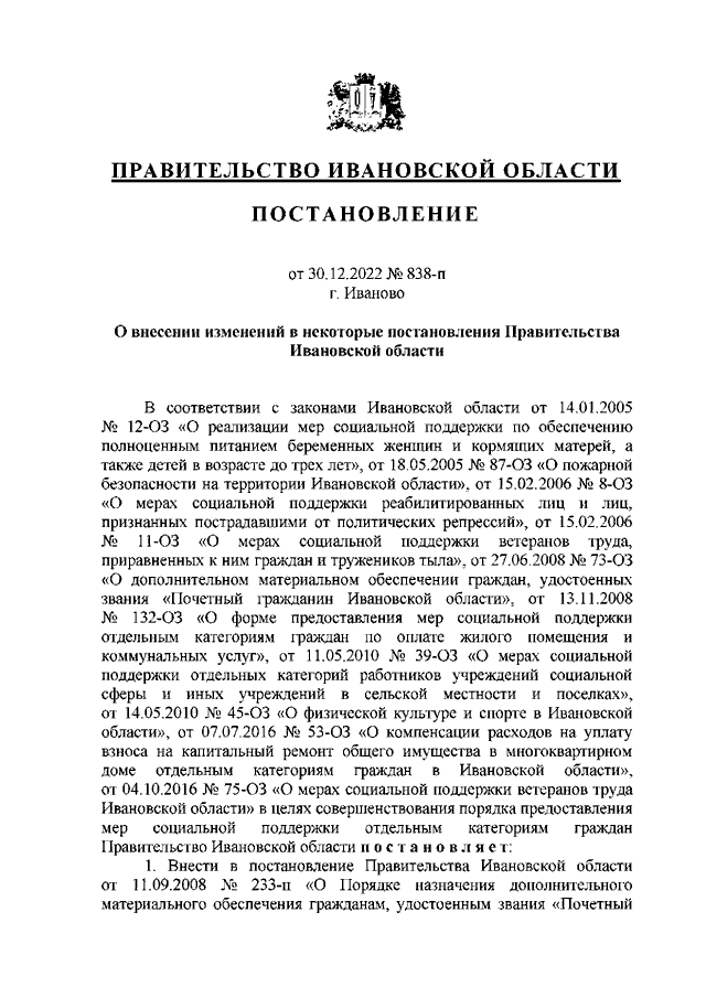 Постановление Правительства Ивановской области от 30.12.2022 N 838-п "О внесении изменений в некоторые постановления Правительства Ивановской области"