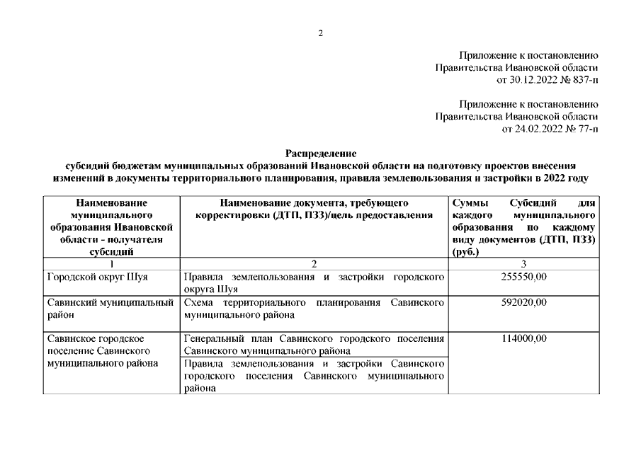 Постановление Правительства Ивановской области от 30.12.2022 N 837-п "О внесении изменения в постановление Правительства Ивановской области от 24.02.2022 N 77-п "О распределении субсидий бюджетам муниципальных образований Ивановской области на подготовку проектов внесения изменений в документы территориального планирования, правила землепользования и застройки в 2022 году"