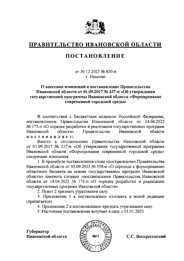 Постановление Правительства Ивановской области от 30.12.2022 N 830-п "О внесении изменений в постановление Правительства Ивановской области от 01.09.2017 N 337-п "Об утверждении государственной программы Ивановской области "Формирование современной городской среды"
