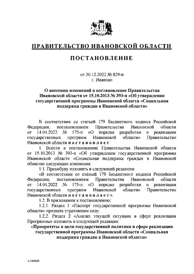 Постановление Правительства Ивановской области от 30.12.2022 N 829-п "О внесении изменений в постановление Правительства Ивановской области от 15.10.2013 N 393-п "Об утверждении государственной программы Ивановской области "Социальная поддержка граждан в Ивановской области"