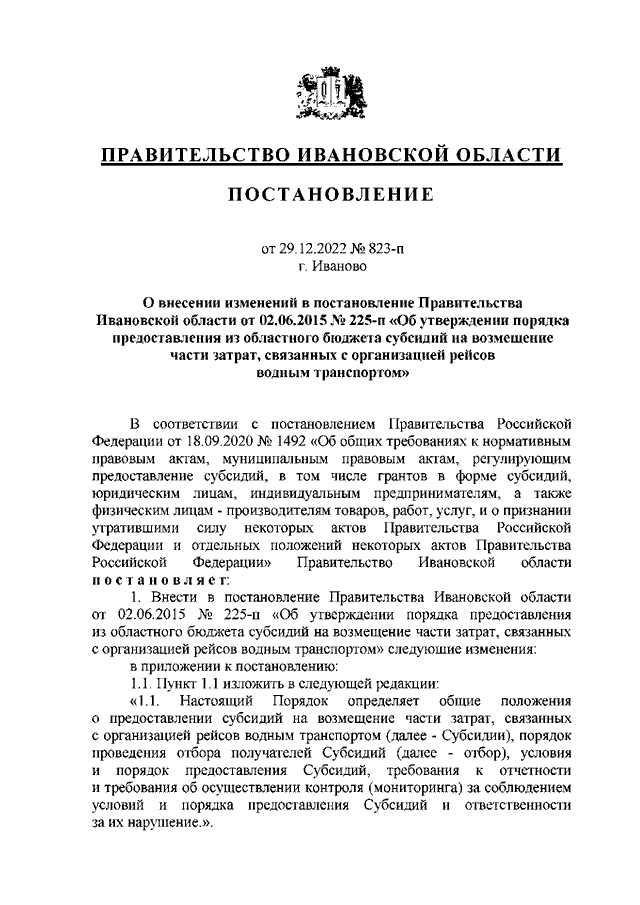 Постановление Правительства Ивановской области от 29.12.2022 N 823-п "О внесении изменений в постановление Правительства Ивановской области от 02.06.2015 N 225-п "Об утверждении порядка предоставления из областного бюджета субсидий на возмещение части затрат, связанных с организацией рейсов водным транспортом"