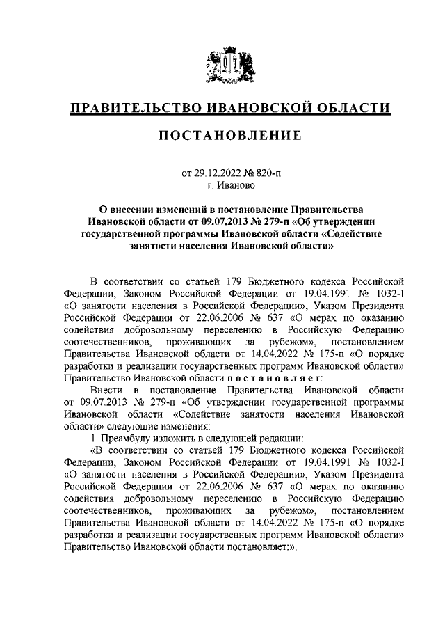 Постановление Правительства Ивановской области от 29.12.2022 N 820-п "О внесении изменений в постановление Правительства Ивановской области от 09.07.2013 N 279-п "Об утверждении государственной программы Ивановской области "Содействие занятости населения Ивановской области"
