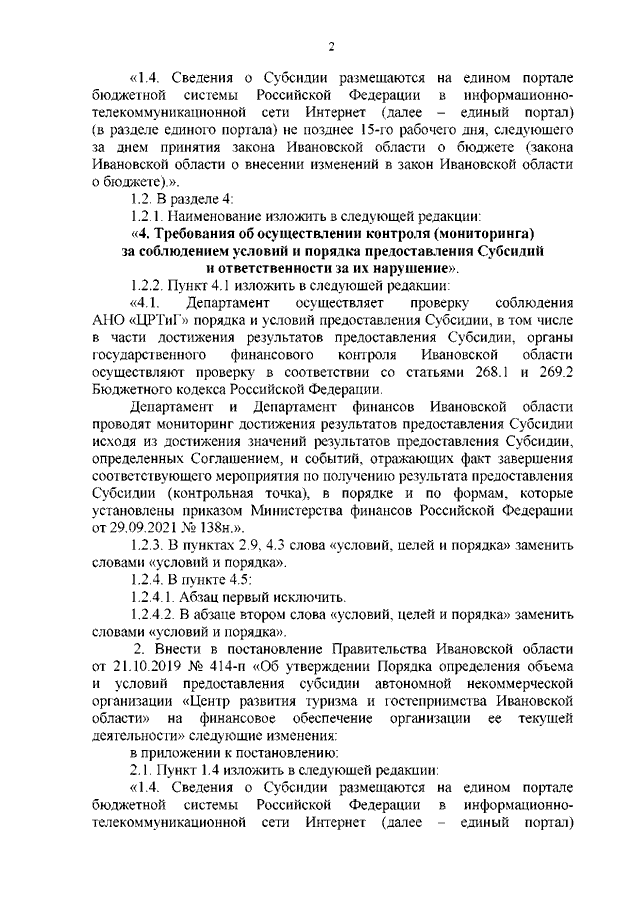 Постановление Правительства Ивановской области от 29.12.2022 N 818-п "О внесении изменений в постановления Правительства Ивановской области от 21.10.2019 N 413-п "Об утверждении Порядка определения объема и условий предоставления субсидии автономной некоммерческой организации "Центр развития туризма и гостеприимства Ивановской области" на продвижение туристического потенциала Ивановской области", от 21.10.2019 N 414-п "Об утверждении Порядка определения объема и условий предоставления субсидии автономной некоммерческой организации "Центр развития туризма и гостеприимства Ивановской области" на финансовое обеспечение организации ее текущей деятельности"