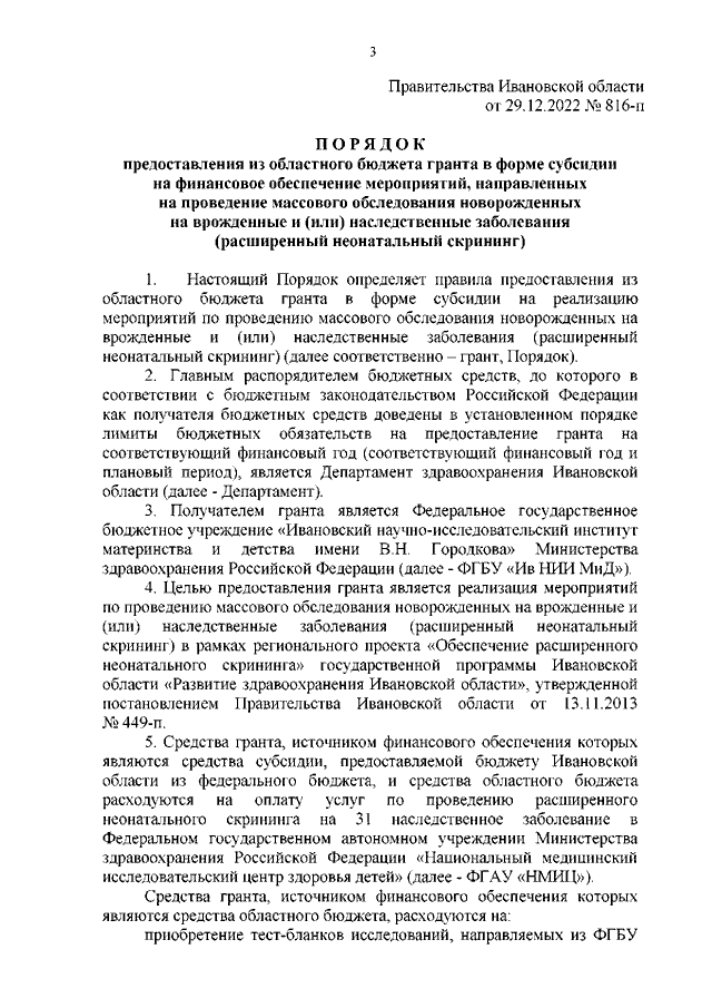 Постановление Правительства Ивановской области от 29.12.2022 N 816-п "О реализации мероприятий по проведению массового обследования новорожденных на врожденные и (или) наследственные заболевания (расширенного неонатального скрининга)" (вместе с "Порядком предоставления из областного бюджета гранта в форме субсидии на финансовое обеспечение мероприятий, направленных на проведение массового обследования новорожденных на врожденные и (или) наследственные заболевания (расширенный неонатальный скрининг)")