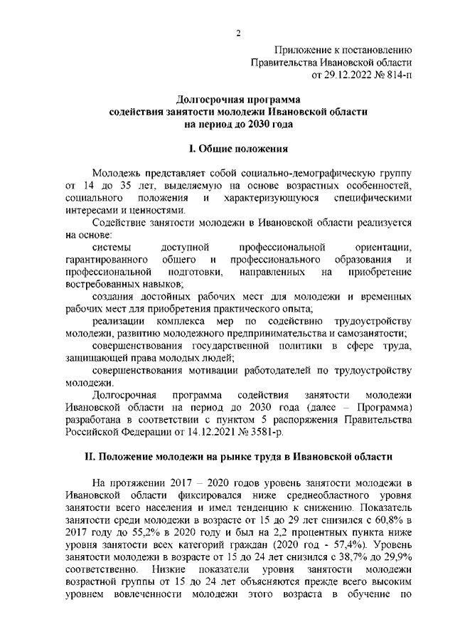 Постановление Правительства Ивановской области от 29.12.2022 N 814-п "Об утверждении Долгосрочной программы содействия занятости молодежи Ивановской области на период до 2030 года"