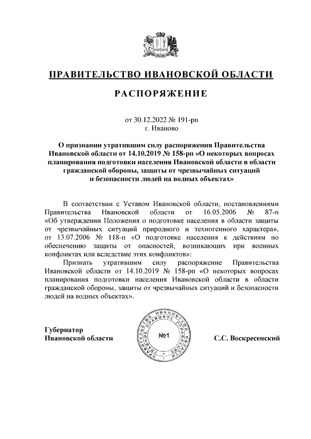 Распоряжение Правительства Ивановской области от 30.12.2022 N 191-рп "О признании утратившим силу распоряжения Правительства Ивановской области от 14.10.2019 N 158-рп "О некоторых вопросах планирования подготовки населения Ивановской области в области гражданской обороны, защиты от чрезвычайных ситуаций и безопасности людей на водных объектах"