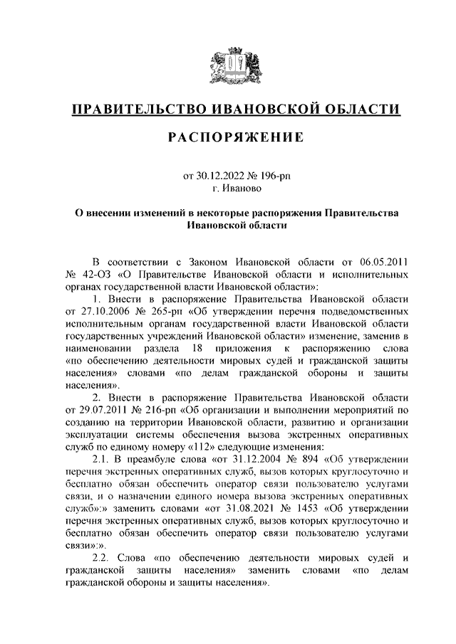 Распоряжение Правительства Ивановской области от 30.12.2022 N 196-рп "О внесении изменений в некоторые распоряжения Правительства Ивановской области"