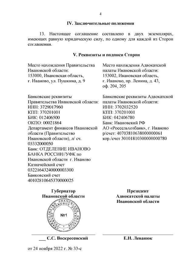 "Соглашение об оказании бесплатной юридической помощи адвокатами, являющимися участниками государственной системы бесплатной юридической помощи" (Заключено в г. Иваново 24.11.2022 N 33-с) (вместе со "Списком адвокатов Ивановской области, участвующих в деятельности государственной системы бесплатной юридической помощи")