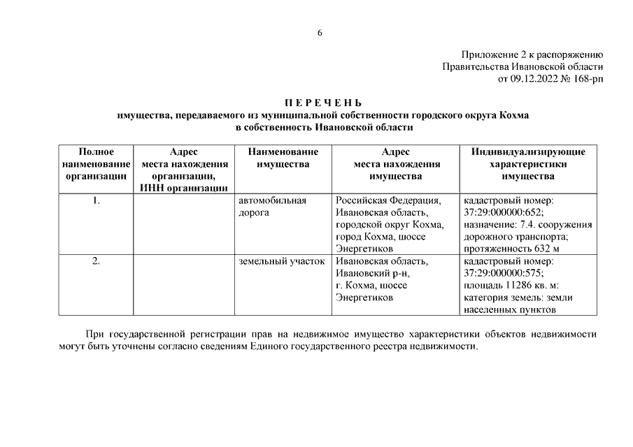 Распоряжение Правительства Ивановской области от 09.12.2022 N 168-рп "О передаче автомобильных дорог и о внесении изменений в распоряжение Правительства Ивановской области от 02.07.2008 N 222-рп "Об утверждении перечня автомобильных дорог общего пользования регионального или межмуниципального значения Ивановской области" (вместе с "Перечнем имущества, передаваемого из муниципальной собственности городского округа Иваново в собственность Ивановской области", "Перечнем имущества, передаваемого из муниципальной собственности городского округа Кохма в собственность Ивановской области")