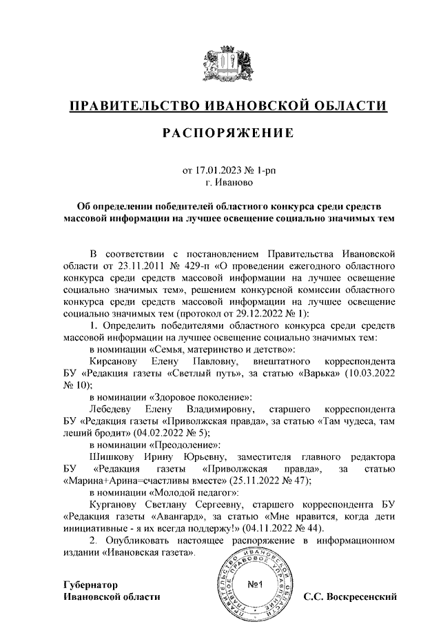 Распоряжение Правительства Ивановской области от 17.01.2023 N 1-рп "Об определении победителей областного конкурса среди средств массовой информации на лучшее освещение социально значимых тем"