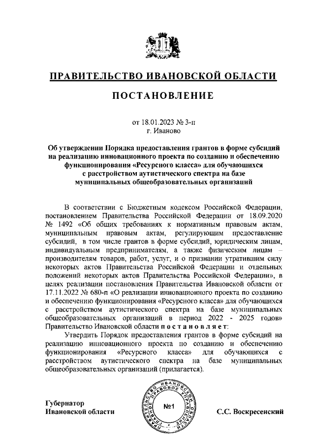 Постановление Правительства Ивановской области от 18.01.2023 N 3-п "Об утверждении Порядка предоставления грантов в форме субсидий на реализацию инновационного проекта по созданию и обеспечению функционирования "Ресурсного класса" для обучающихся с расстройством аутистического спектра на базе муниципальных общеобразовательных организаций"