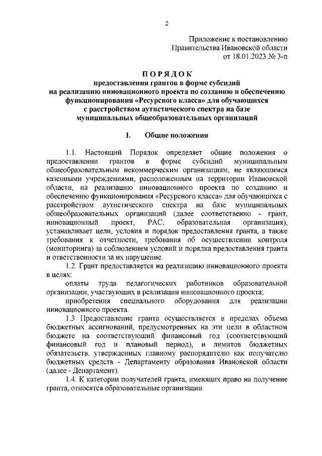 Постановление Правительства Ивановской области от 18.01.2023 N 3-п "Об утверждении Порядка предоставления грантов в форме субсидий на реализацию инновационного проекта по созданию и обеспечению функционирования "Ресурсного класса" для обучающихся с расстройством аутистического спектра на базе муниципальных общеобразовательных организаций"