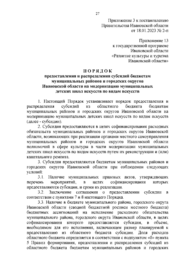 Постановление Правительства Ивановской области от 18.01.2023 N 2-п "О внесении изменений в постановления Правительства Ивановской области от 06.12.2017 N 455-п "Об утверждении государственной программы Ивановской области "Развитие культуры и туризма в Ивановской области" и от 13.11.2013 N 450-п "Об утверждении государственной программы "Развитие образования Ивановской области" (вместе с "Порядком предоставления и распределения субсидий бюджетам муниципальных образований Ивановской области на реконструкцию и капитальный ремонт муниципальных музеев", "Порядком предоставления и распределения бюджетам муниципальных районов и городских округов Ивановской области субсидий на оснащение образовательных учреждений в сфере культуры музыкальными инструментами, оборудованием и учебными материалами", "Порядком предоставления и распределения субсидий бюджетам муниципальных районов и городских округов Ивановской области на модернизацию муниципальных детских школ искусств по видам искусств", "Перечнем объектов капитального строительства, мероприятий (укрупненных инвестиционных проектов), объектов недвижимости, реализуемых в рамках государственной программы "Развитие культуры и туризма в Ивановской области")